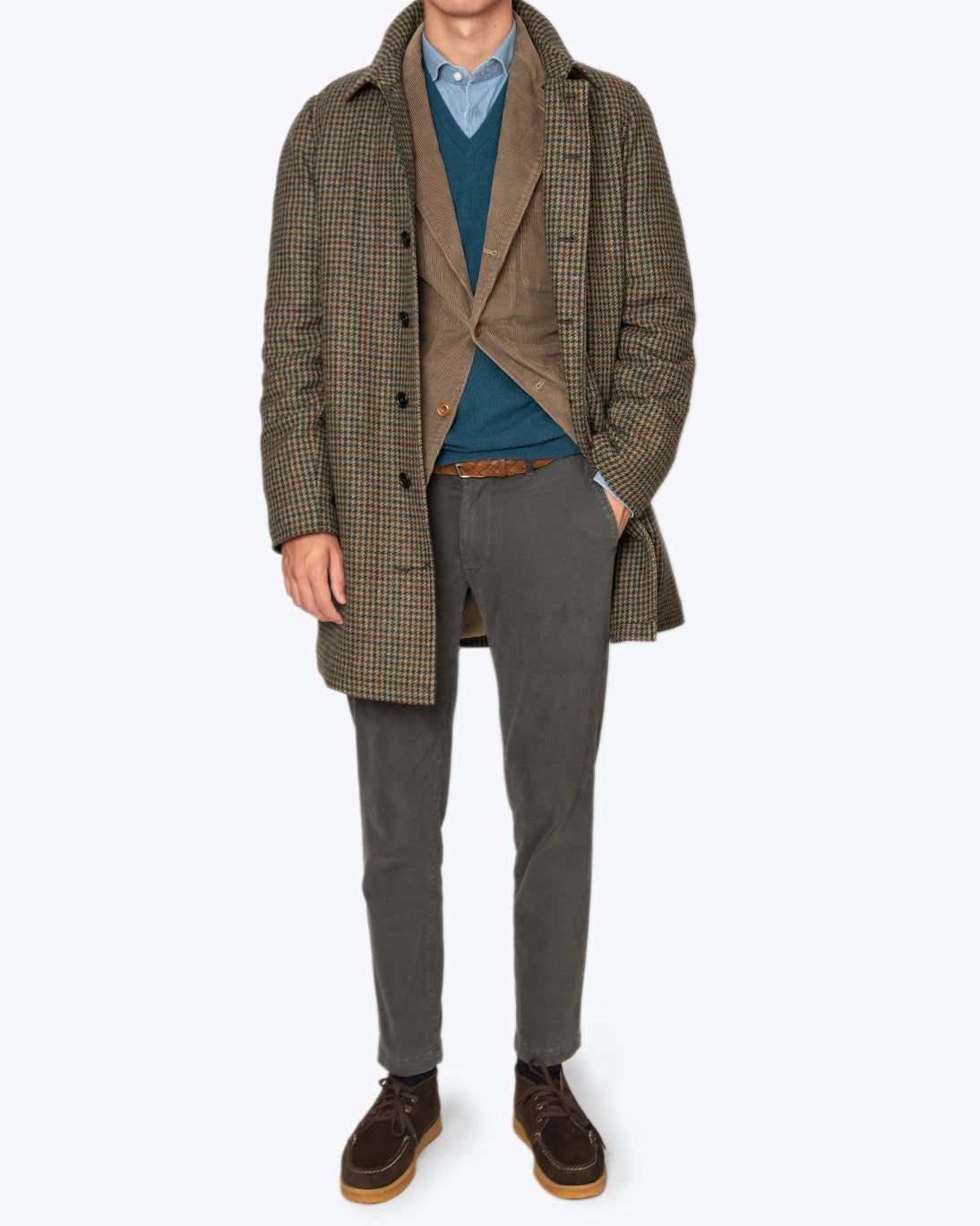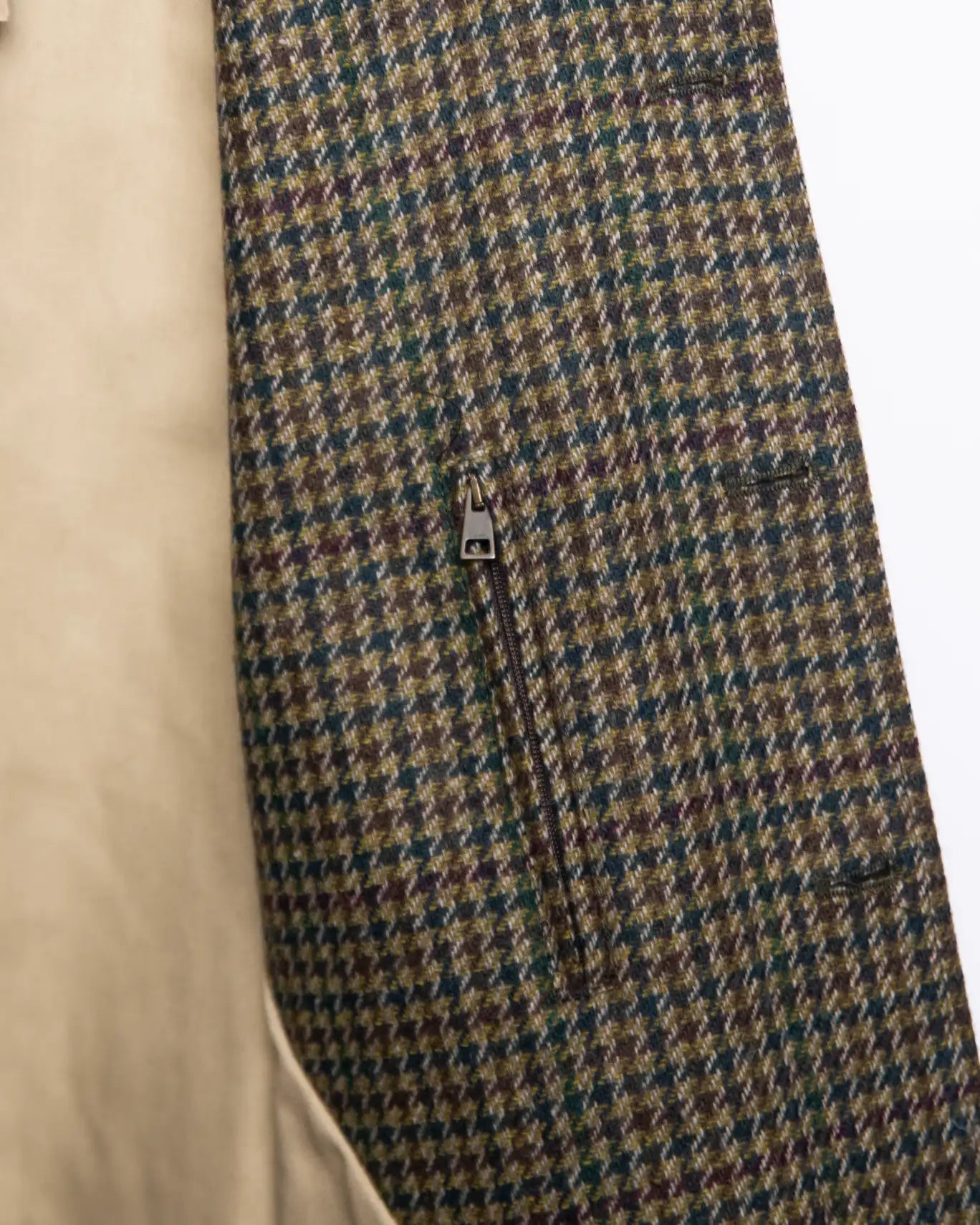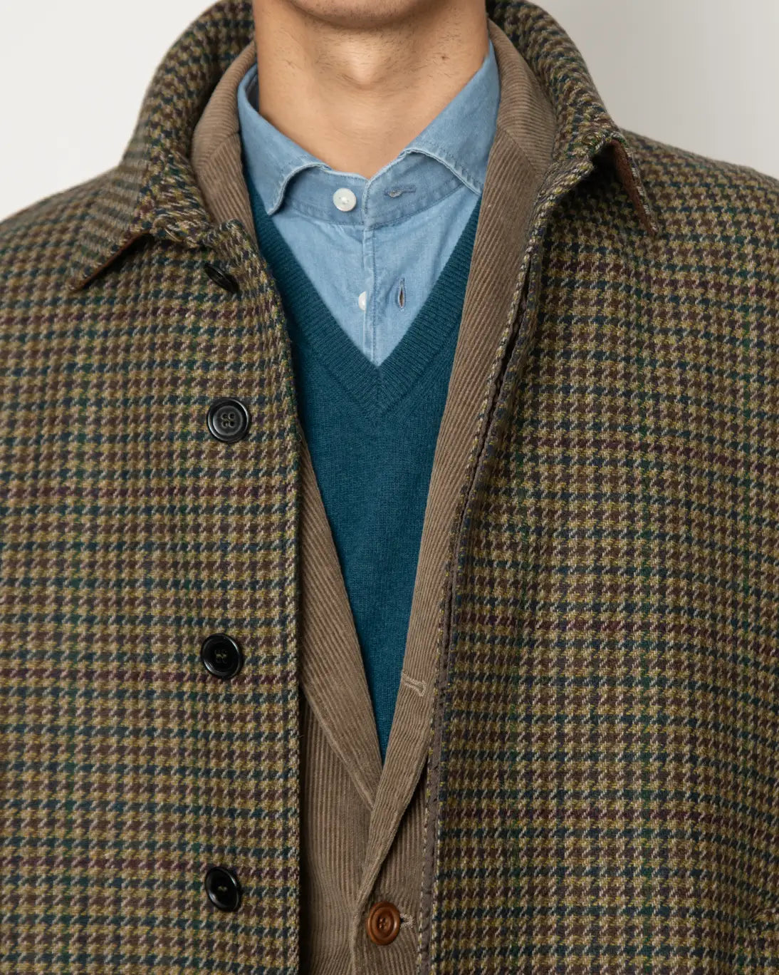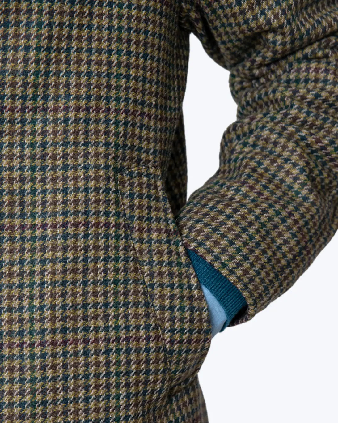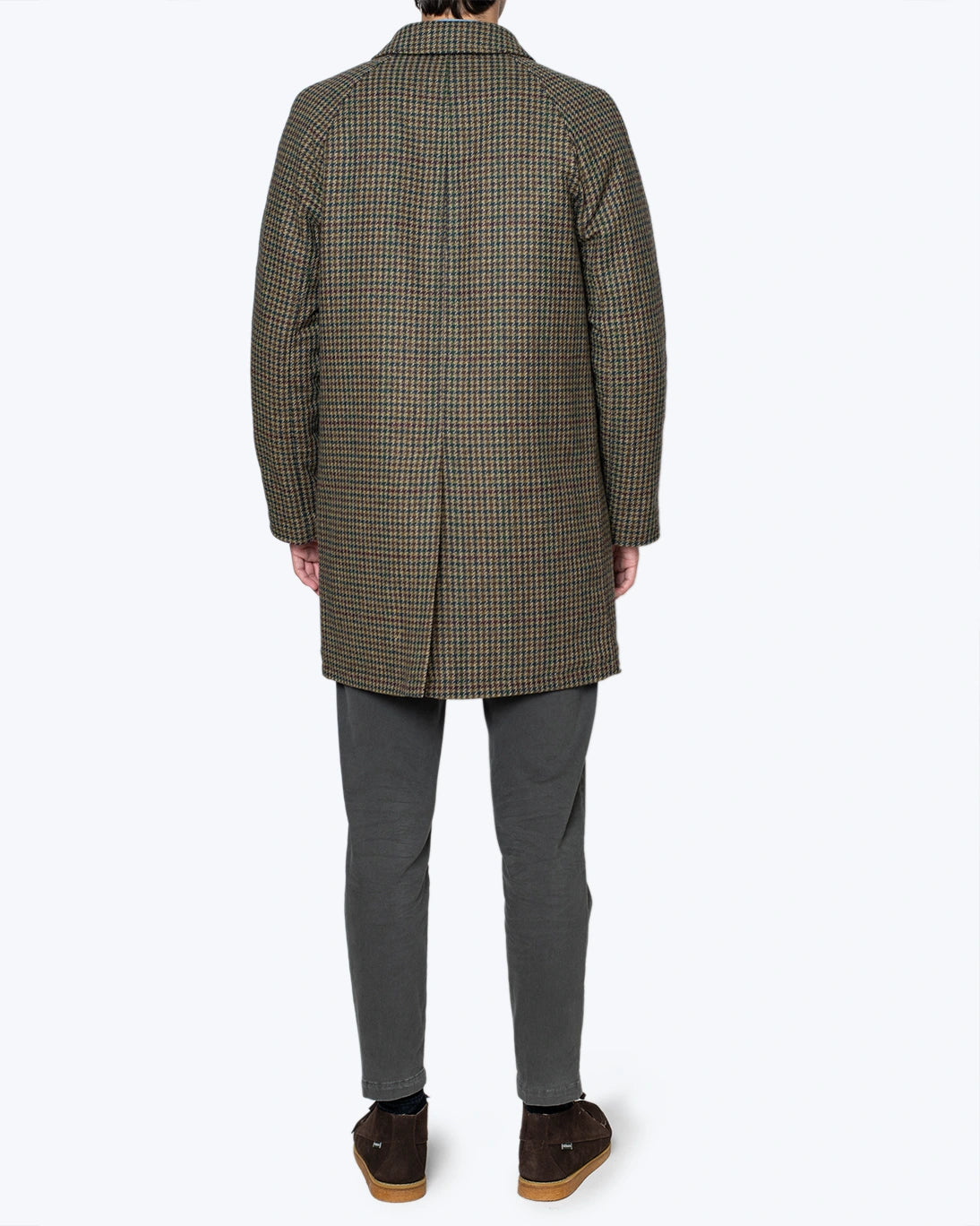 Abrigo de lana de la firma Zerosettanta, con un diseño de pata de gallo en tonos verdes, burdeos y amarillo.