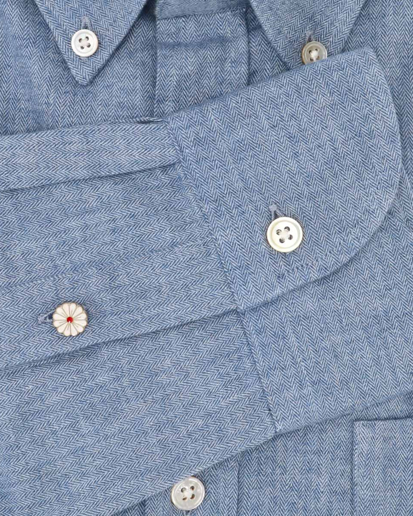 It features a buttoned collar and button placket . It also has a pocket at chest height.