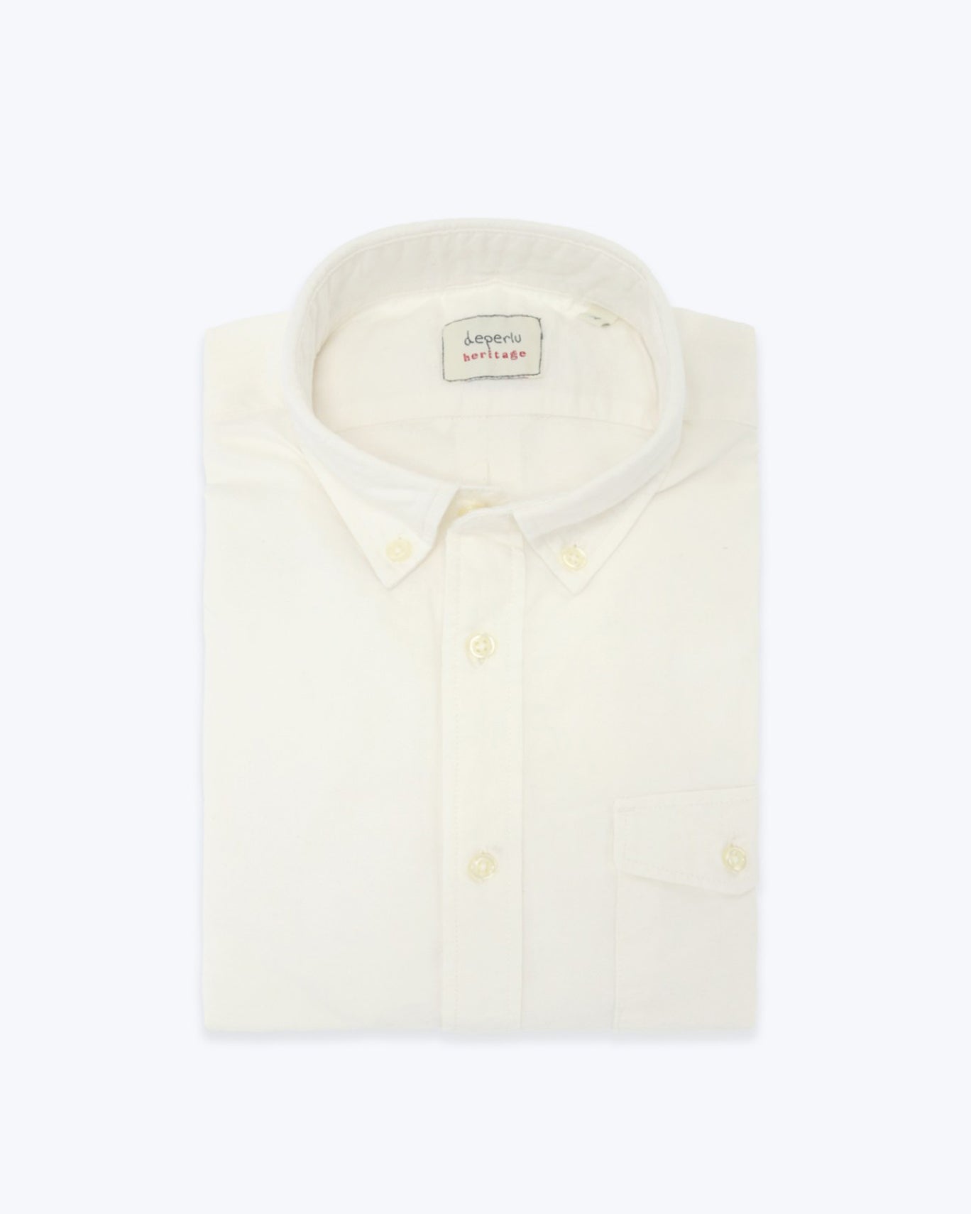 White Deperlu brand shirt with buttoned collar, button placket and chest pocket with flap and button.