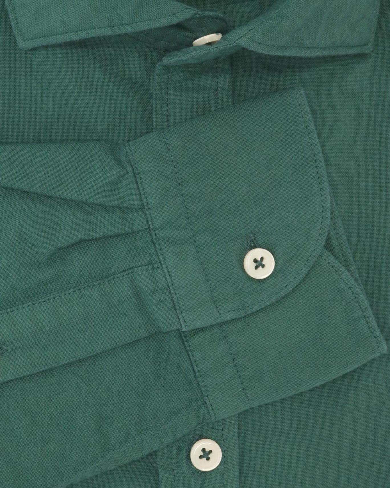 Ghirardelli brand shirt in dark green, with cutaway collar and button placket.