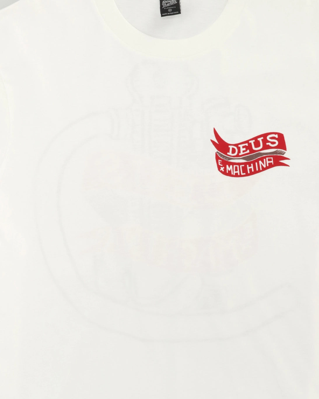 Short sleeve T-shirt from the Deus brand, in white color. With a drawing at chest level and another at the back.