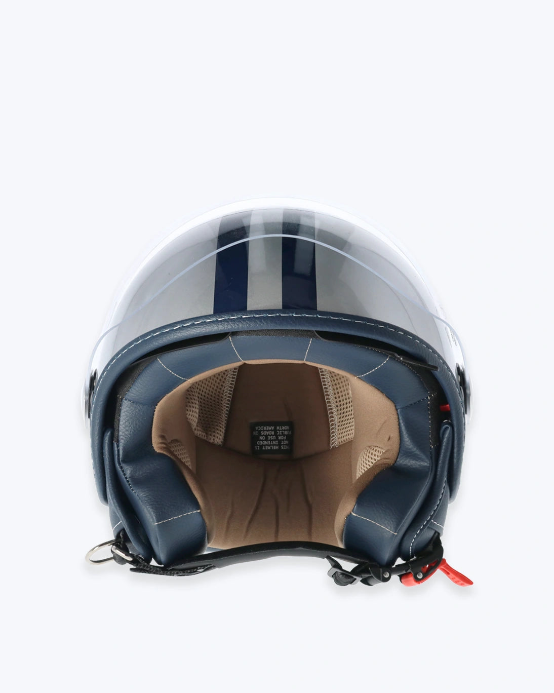 It features blue leather finishes and a beige interior . The closure is adjustable and has a pad at chin height to prevent chafing from the strap.