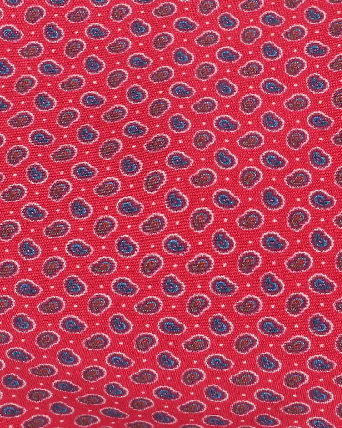 Silk tie by the brand Fulham, in red with navy blue patterns.
