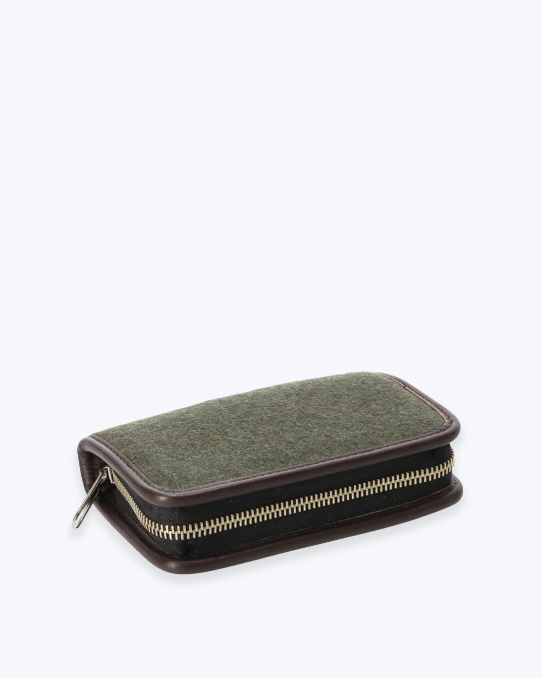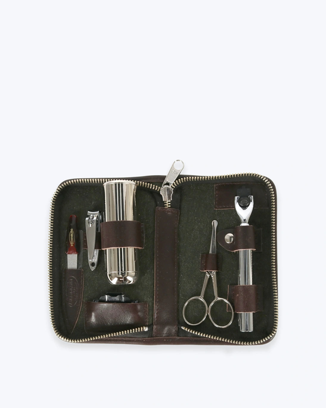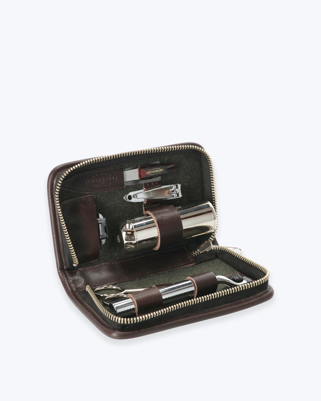 F.Hammann brand toiletry case, in loden green color. It includes nail clippers, razor, scissors, and nail file. It closes with a zipper.