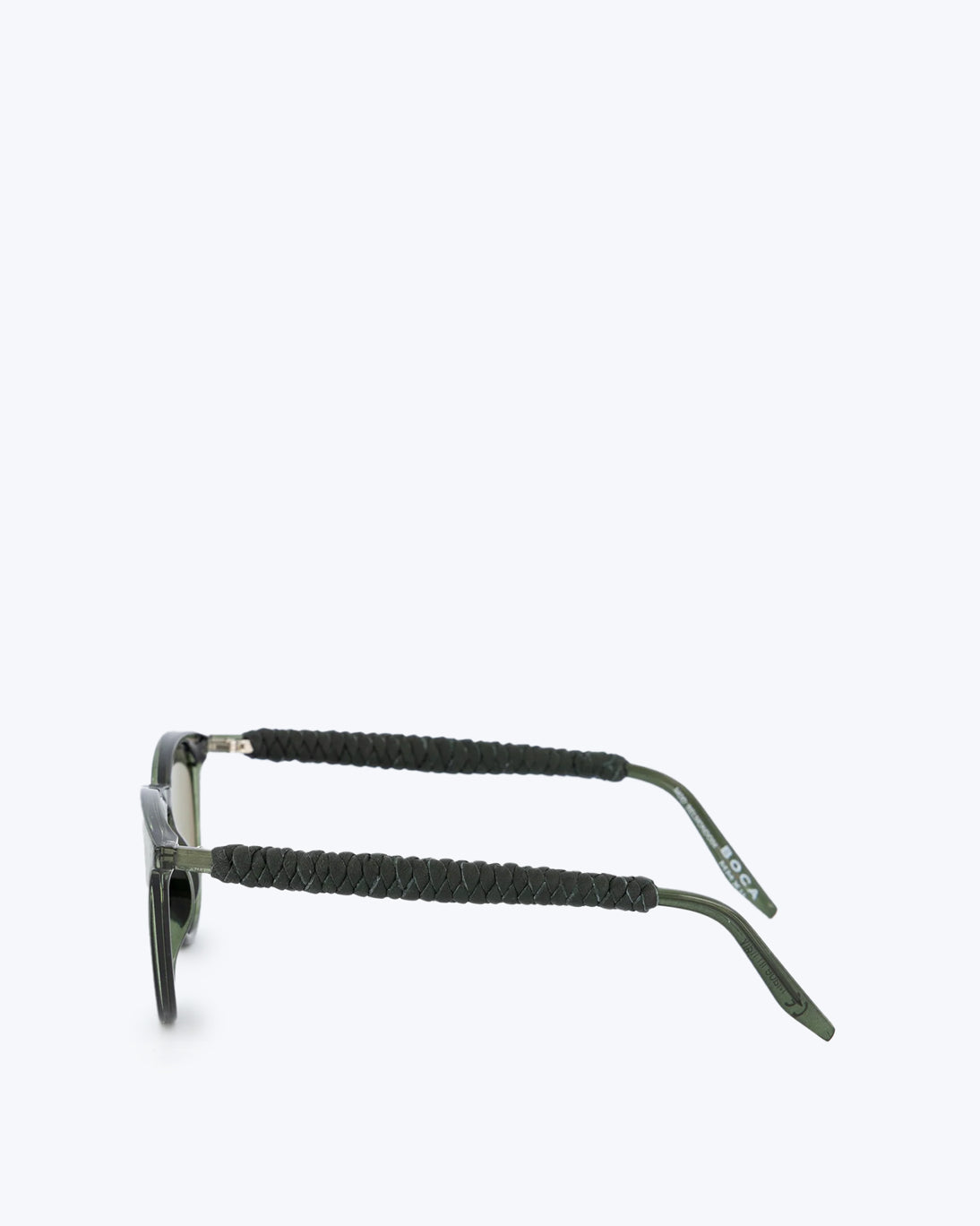 Glasses from the Boca brand, made with the finest Swiss TR90 frame and hand-braided leather from MEXICO. The sturdy satin frame in deep green is complemented by green lenses that reduce light transmission by 75%, ensuring maximum comfort in bright conditions. The semi-flat B2 nylon lenses provide 100% protection against harmful UVA and UVB rays.