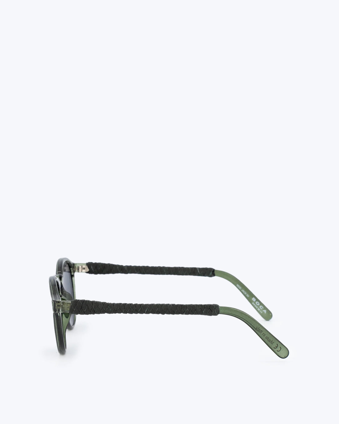 Sunglasses from the Boca brand, made in Italy with a lightweight and durable Swiss TR90 satin navy frame, featuring an elegant braided leather design made in Mexico with premium quality sheep leather. Completed with gray lenses that reduce light transmission by 75% and provide 100% protection against UVA and UVB rays.