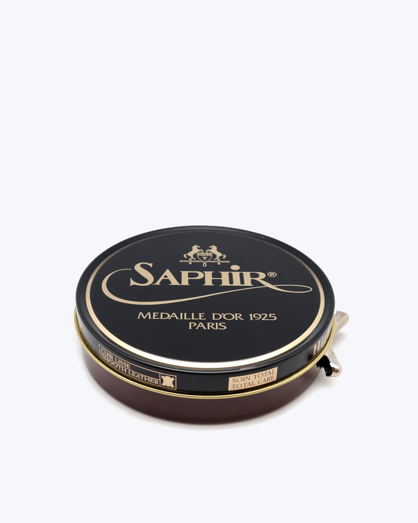 Saphir leather care tin in medium brown.