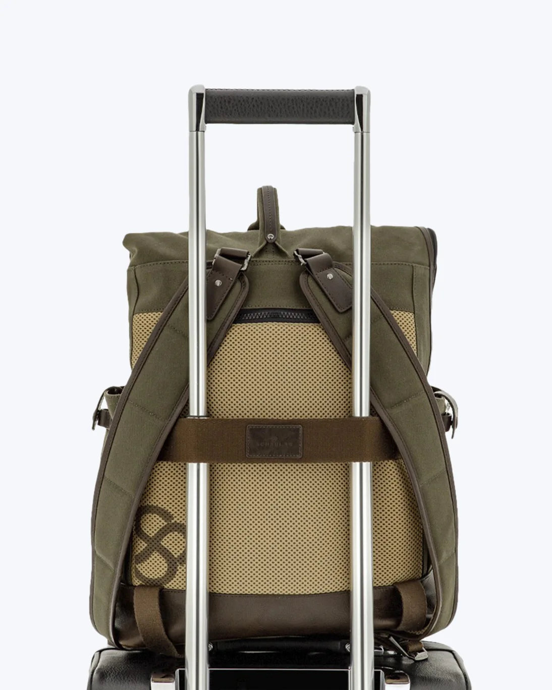 Backpack made of canvas, Scharlau brand, 100% cotton and cowhide. Inside, it has a metal plate to personalize with your name or a special message by engraving.