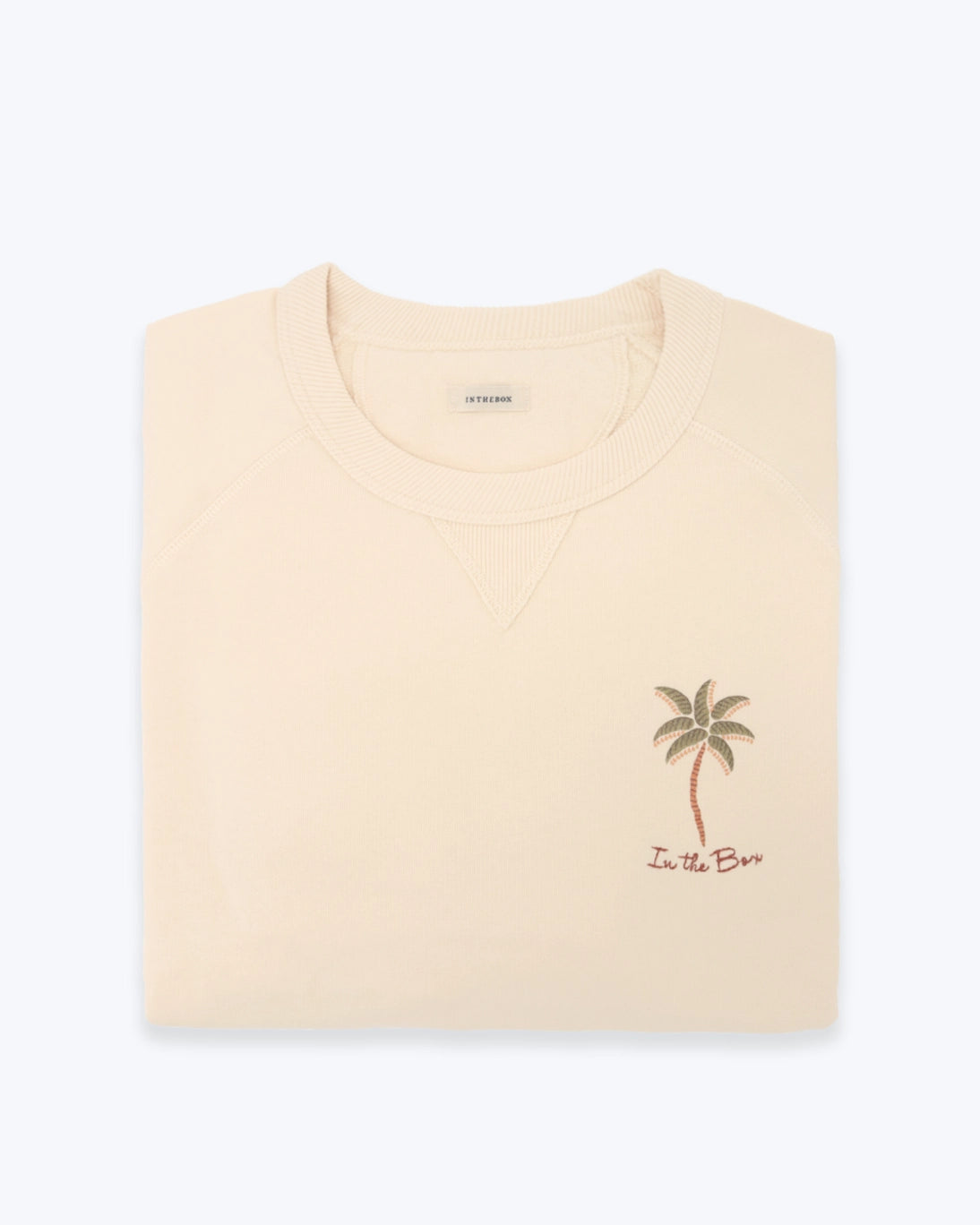 Inthebox round neck sweatshirt in beige, with a drawing of a palm tree on the chest and several palm trees on the back.