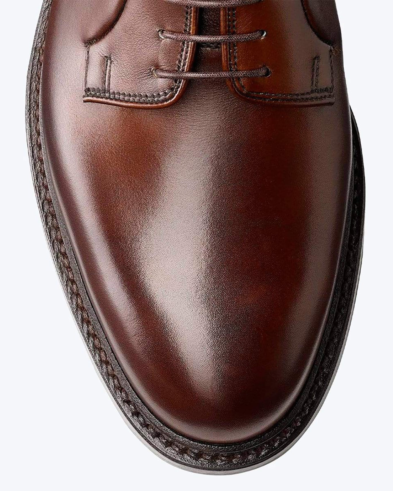 Burnished calfskin. Dark brown. Studded rubber sole. Standard width (E).