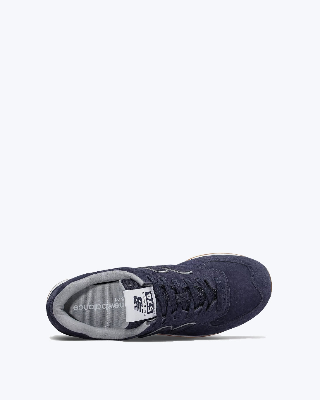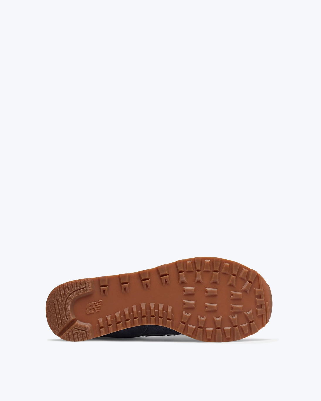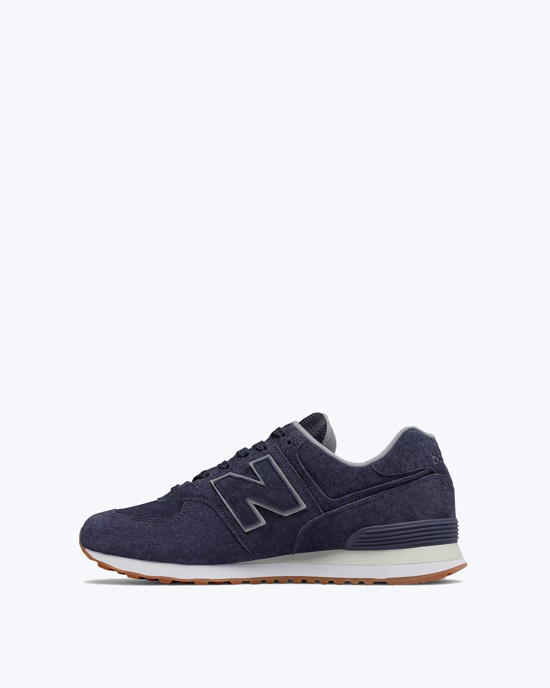 Zapatillas azules de la marca New Balance modelo 574, con empeine de ante de cerdo, de diseño clásico y resistente.