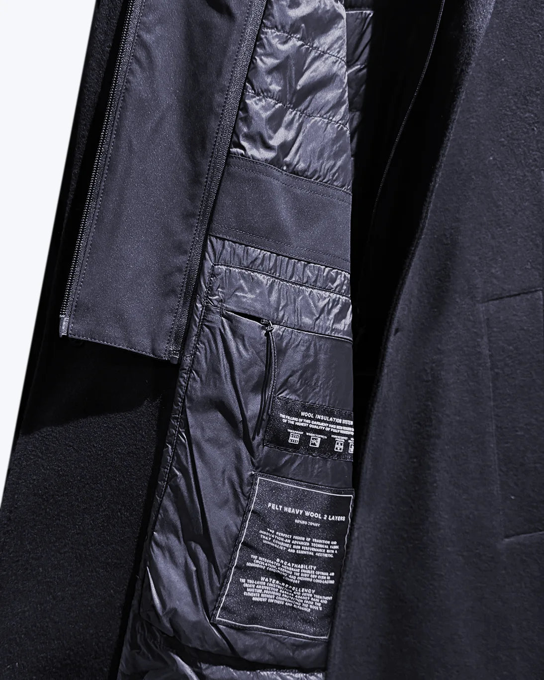 Se abrocha con tres botones, y tiene tapetas acolchadas extraíbles (mediante cremallera) en azul, así como un forro acolchado, que le aportan un extra de abrigo y aislamiento del viento. Del cuello de las tapetas mediante una cremallera se extrae una capucha oculta.