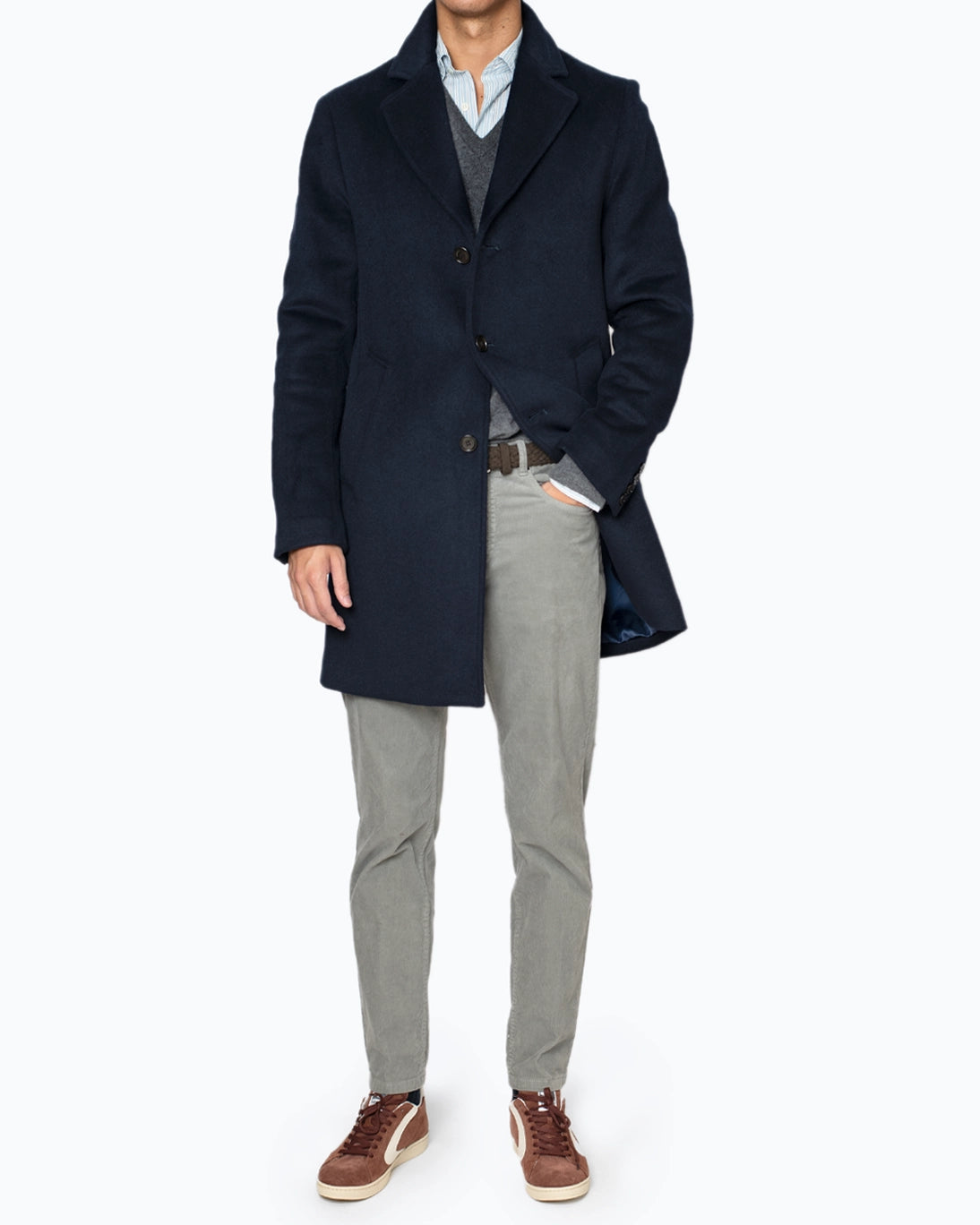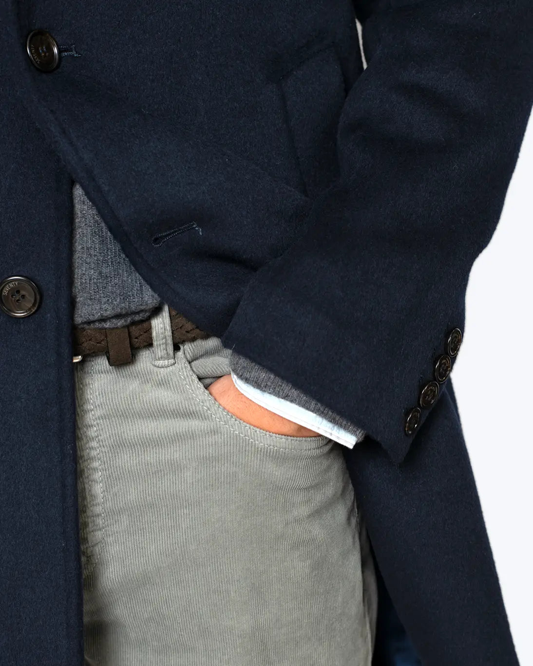 Se cierra con tres botones en la parte frontal y cuenta con dos bolsillos laterales, además de dos bolsillos en el interior. En la parte posterior presenta una abertura central que facilita la comodidad.