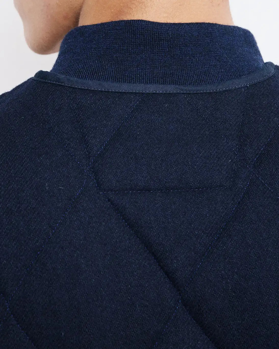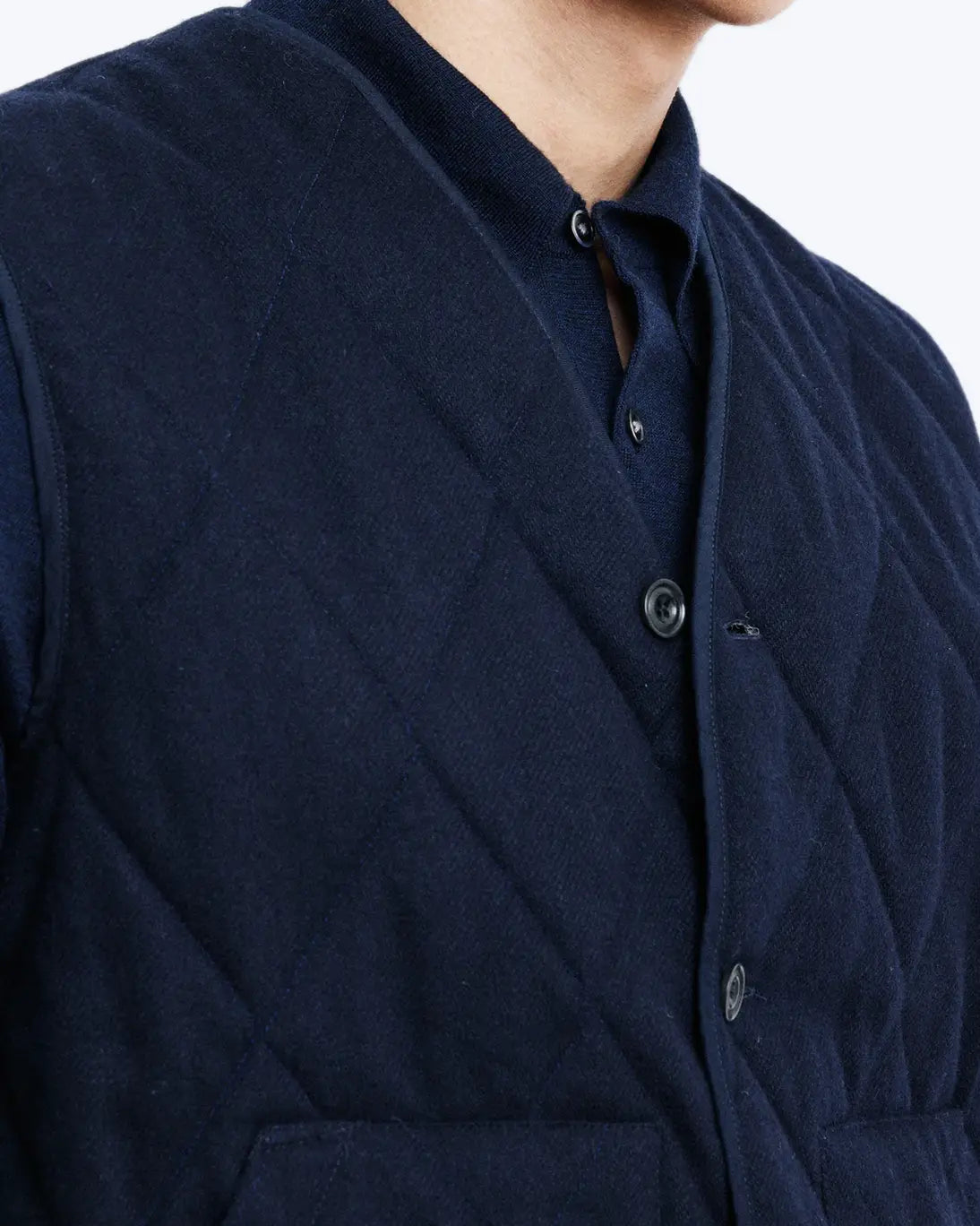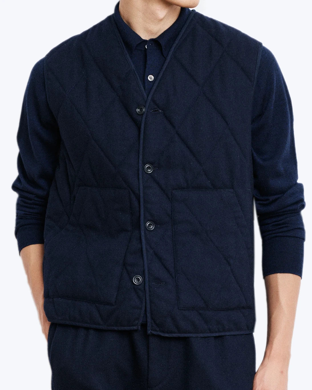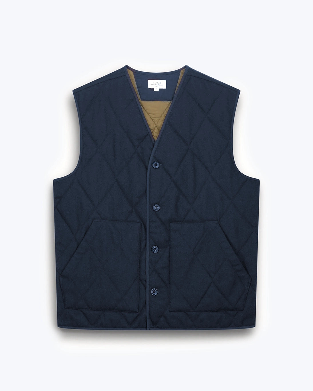 Chaleco azul sin cuello de la marca Hartford con tejido acolchado en rombos.