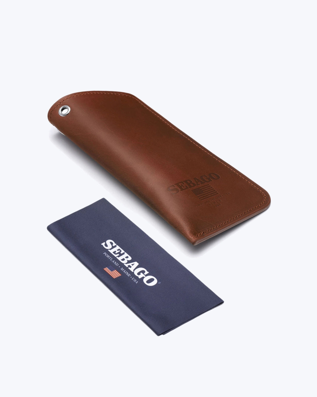 Includes a leather case with a microfibre cleaning cloth and a cardboard box.