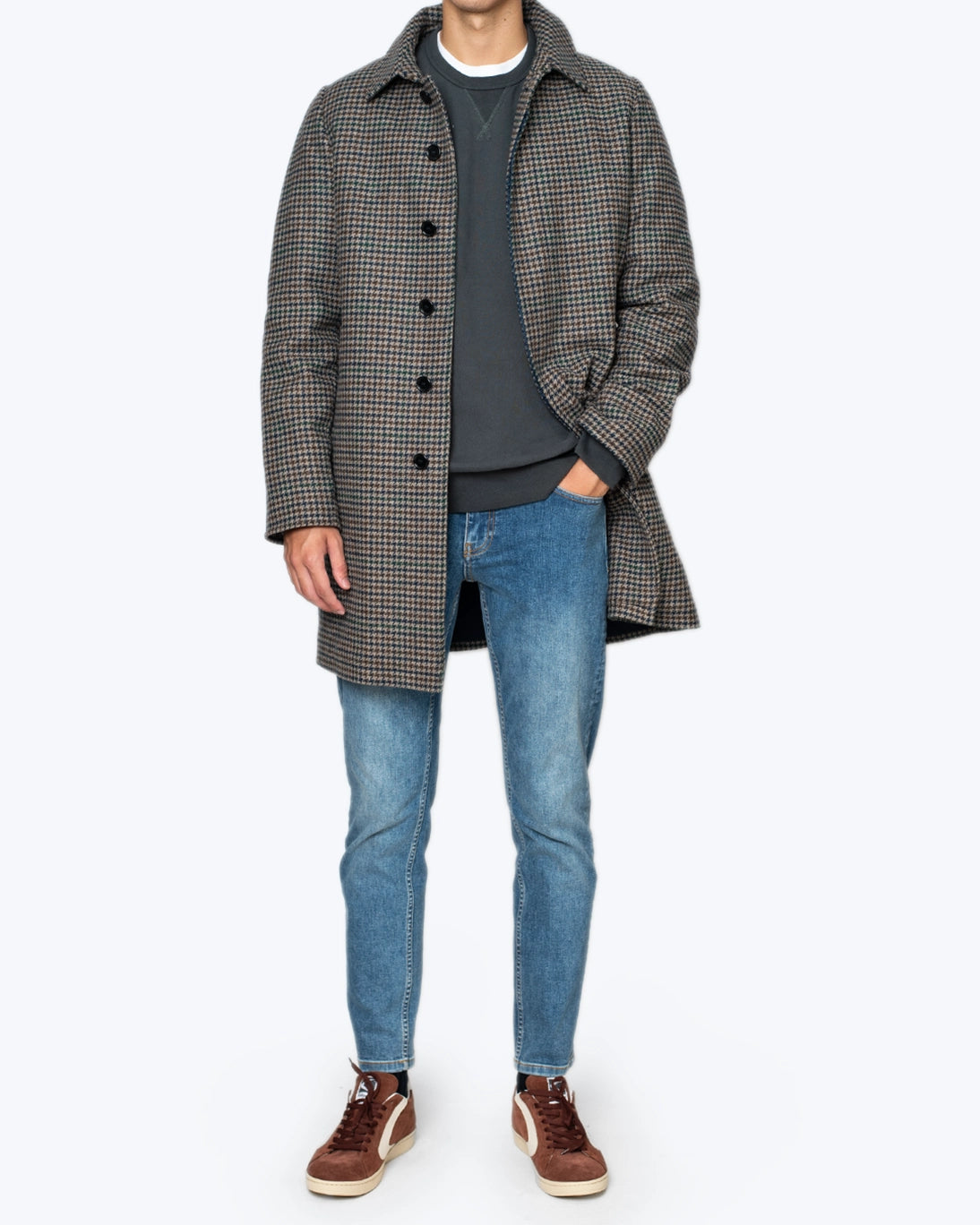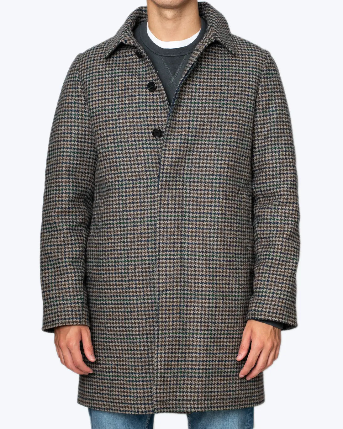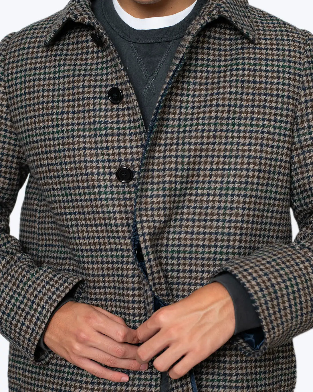 Abrigo de lana de la firma Zerosettanta, con un diseño de pata de gallo en tonos beige, azul y verde.