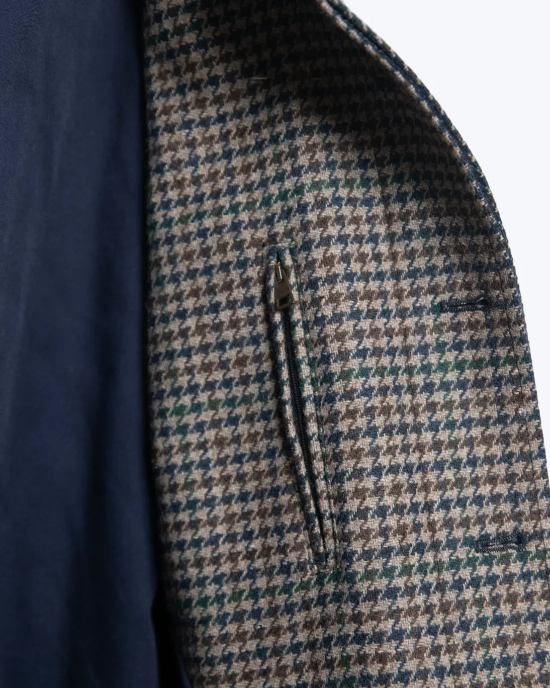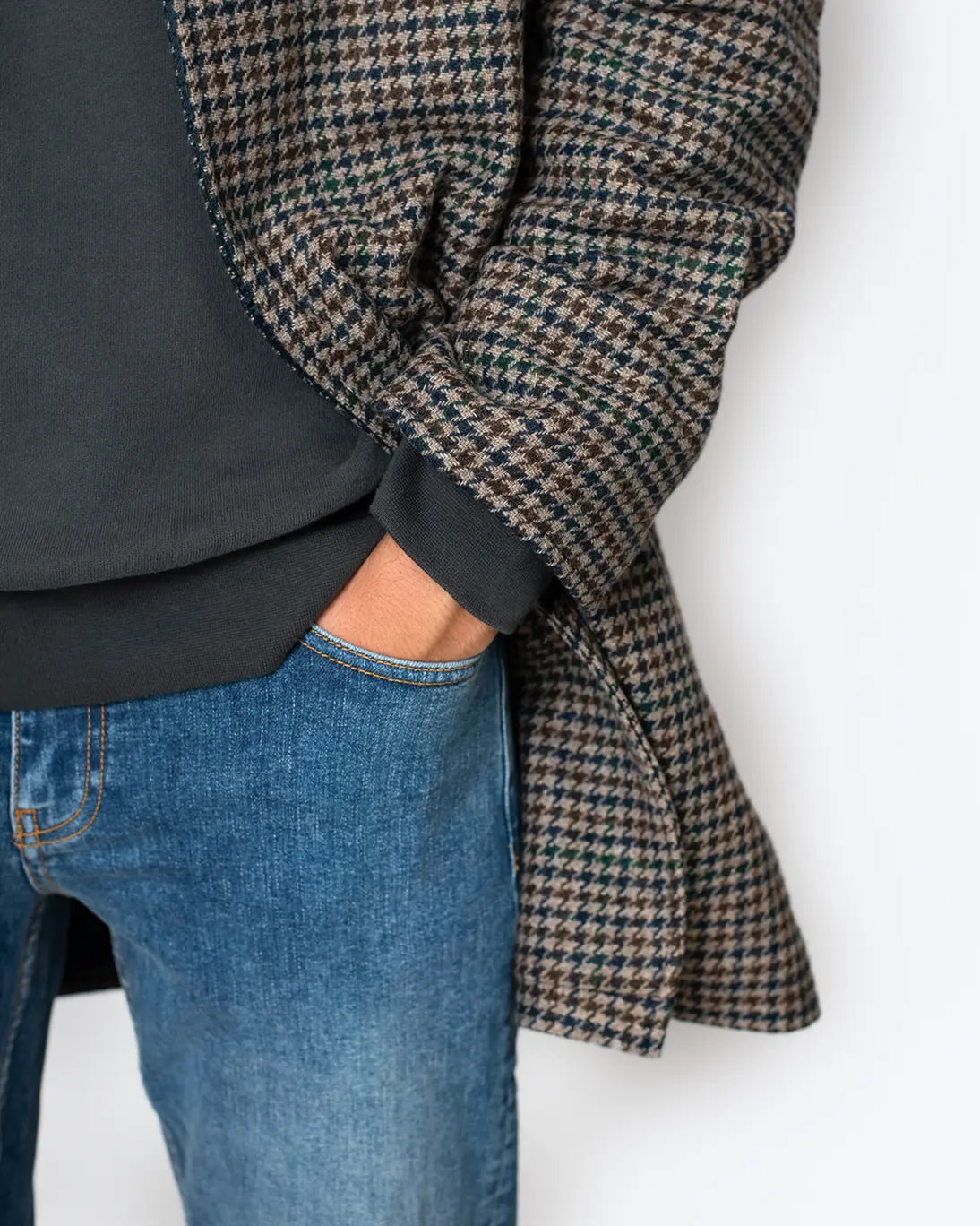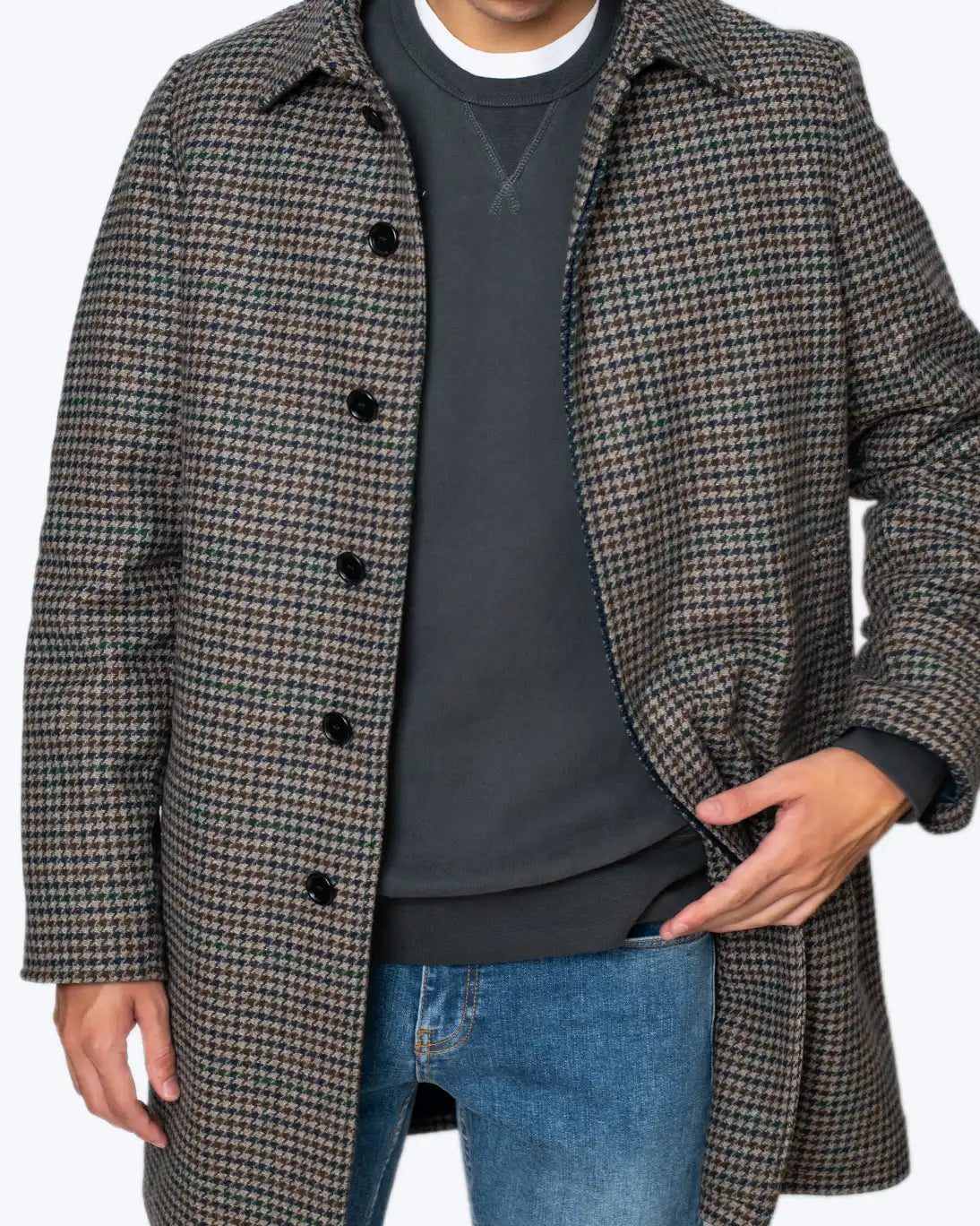 Abrigo de lana de la firma Zerosettanta, con un diseño de pata de gallo en tonos beige, azul y verde.