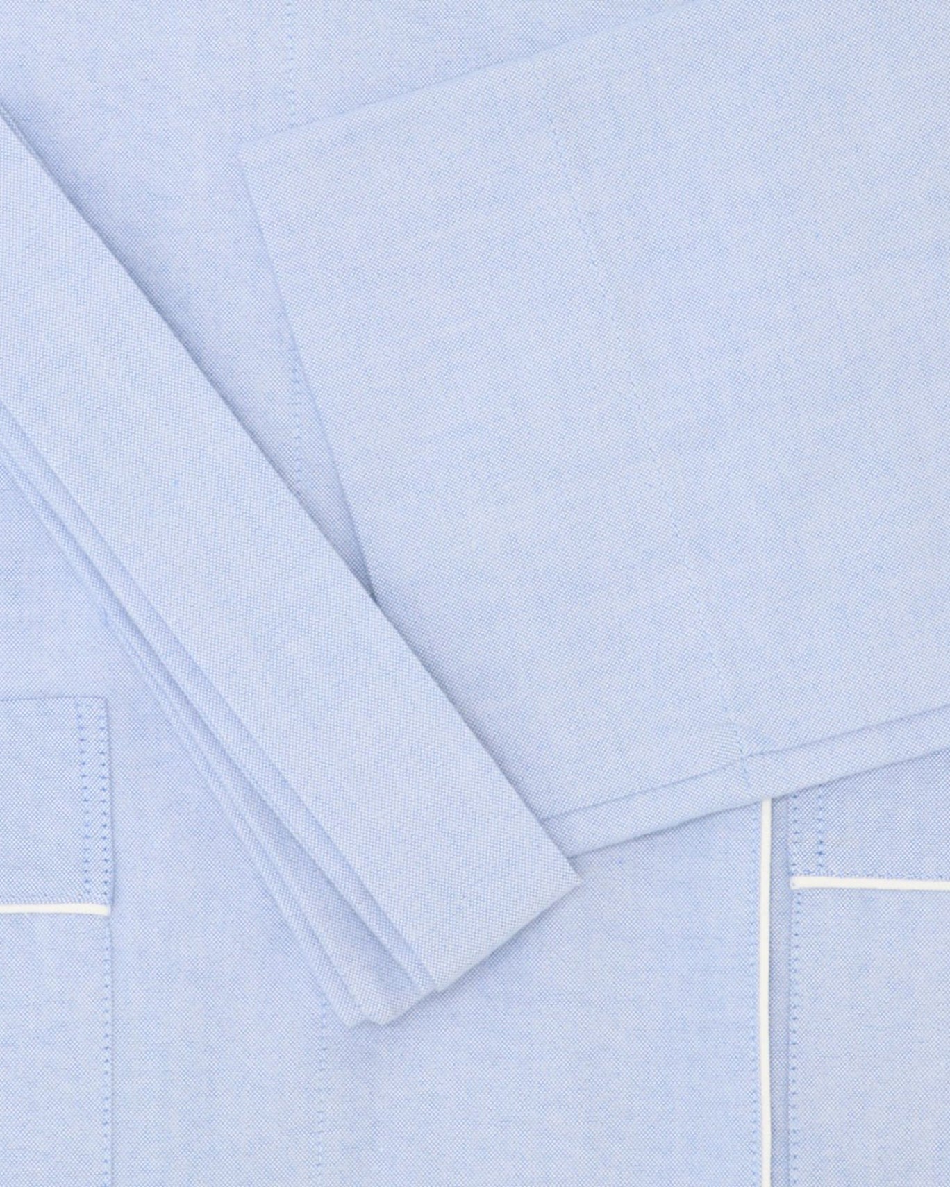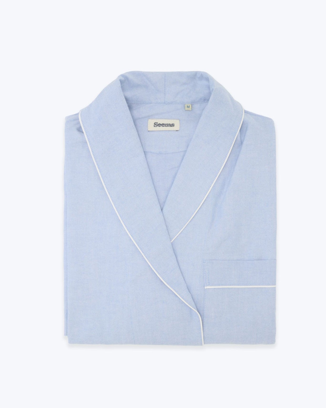 Bata de la marca Seems, color azul claro. Cruce delantero con cinturón. Bolsillo a la altura del pecho y dos a la altura de la cintura.