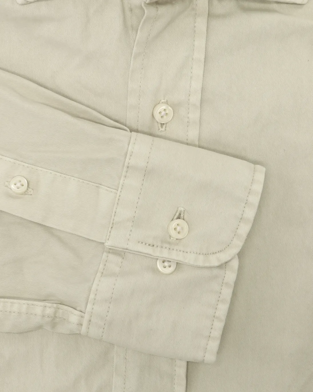 Se cierra mediante botones frontales con tapeta, presenta cuello cutaway y las mangas rematan en puños con dos botones.