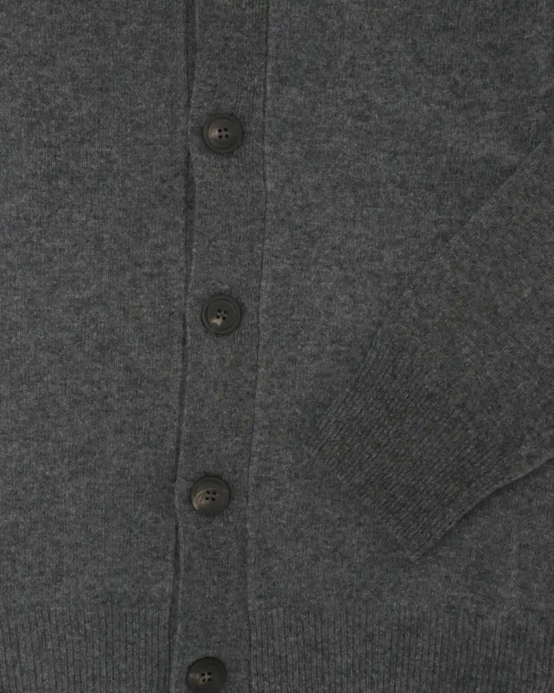 Elaborado en punto de primera calidad, presenta un cierre de cinco botones y acabados acanalados en los puños y el bajo.