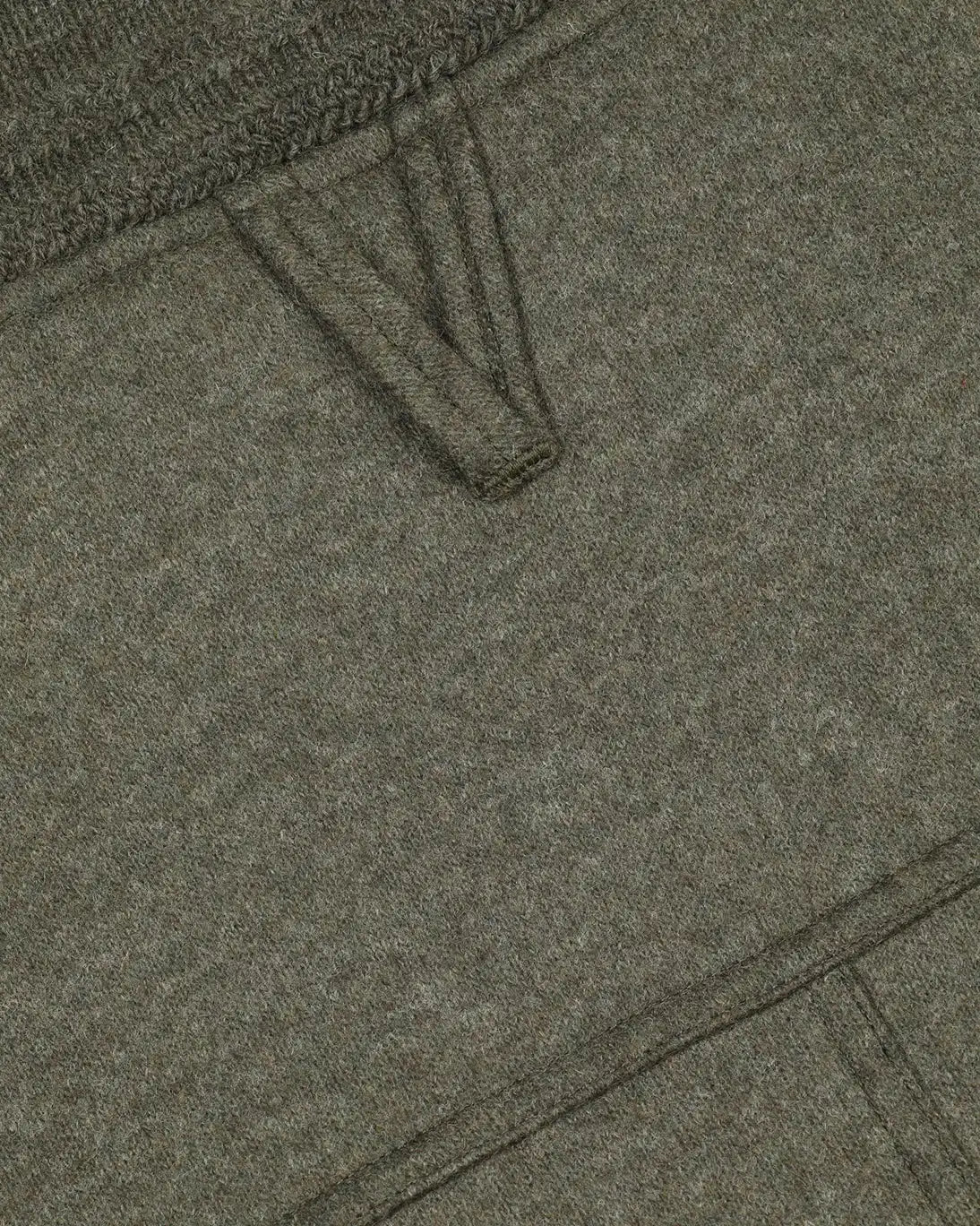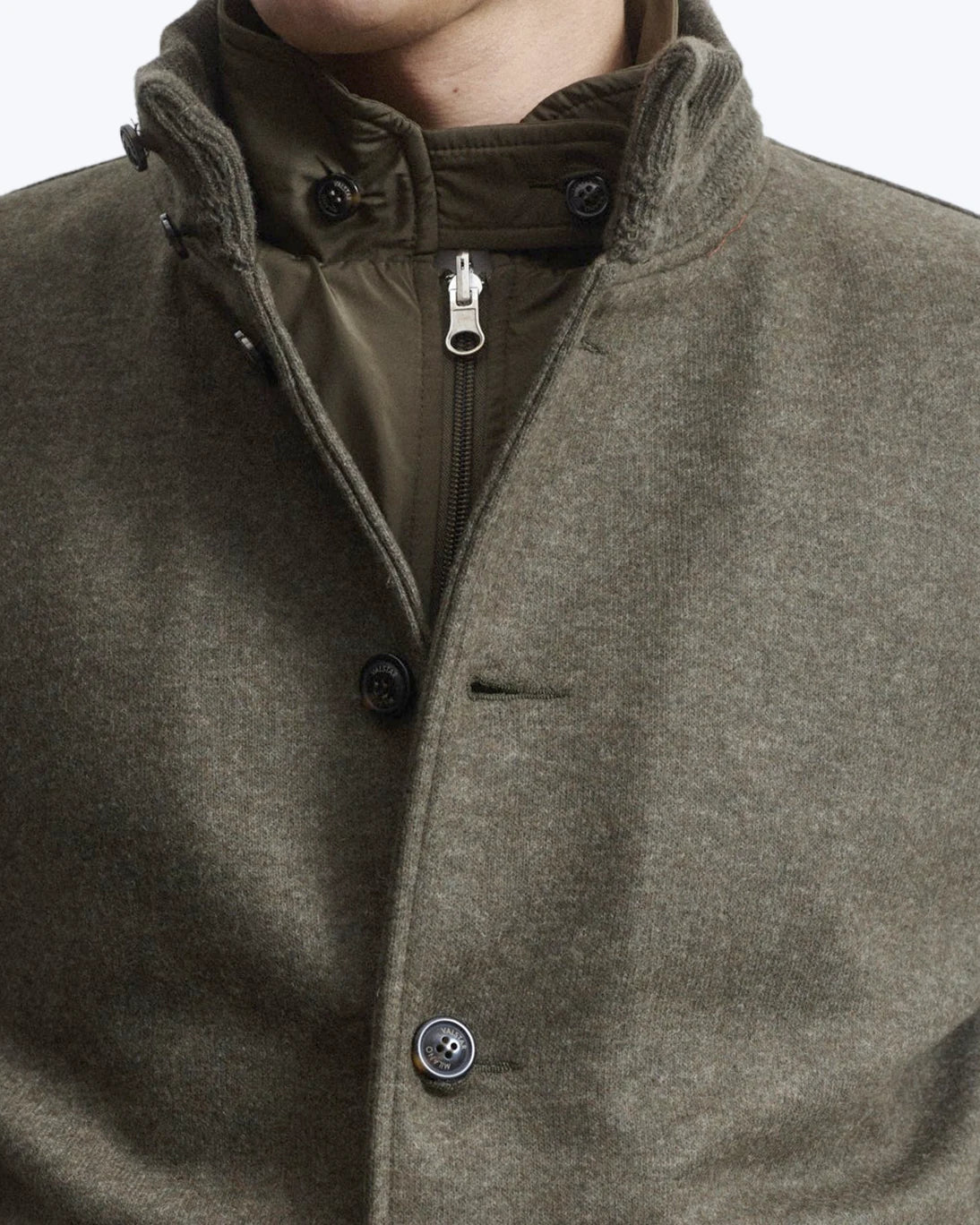 Confeccionada en tejido de fieltro de mezcla de lana, incorpora un chaleco acolchado desmontable que aporta comodidad técnica y versatilidad. Presenta botones con el logotipo, bolsillos con pliegues y remates de punto, que también funcionan como bolsillos laterales, ideales para proteger las manos del frío con mayor comodidad.