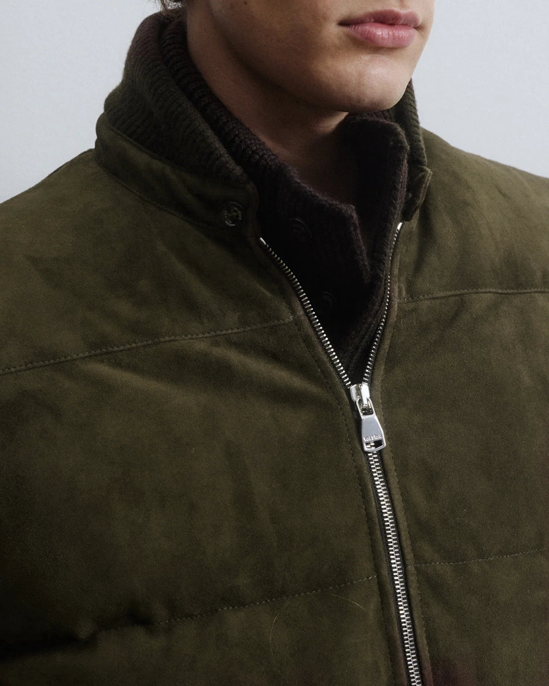 Confeccionado en ante fino y acolchado con suave plumón de ganso, combinando calidez y distinción.