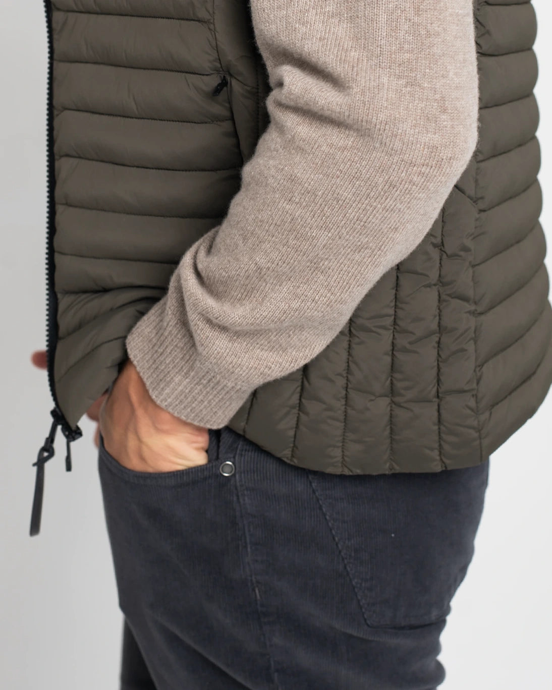 Chaleco acolchado de la marca Homeward, en color verde. Se cierra con cremallera frontal bidireccional y tiene bolsillos laterales con cremallera invisible. Además, tiene bolsillos en el interior.