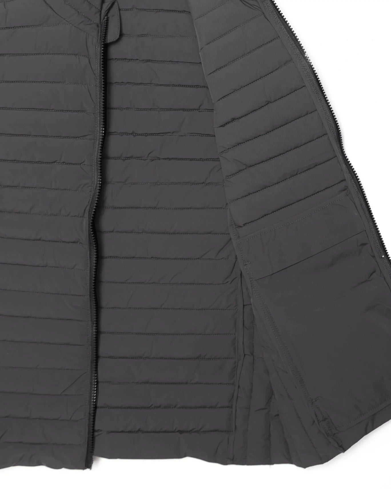 Se cierra con cremallera frontal bidireccional y tiene bolsillos laterales con cremallera invisible. Además, de dos en el interior.