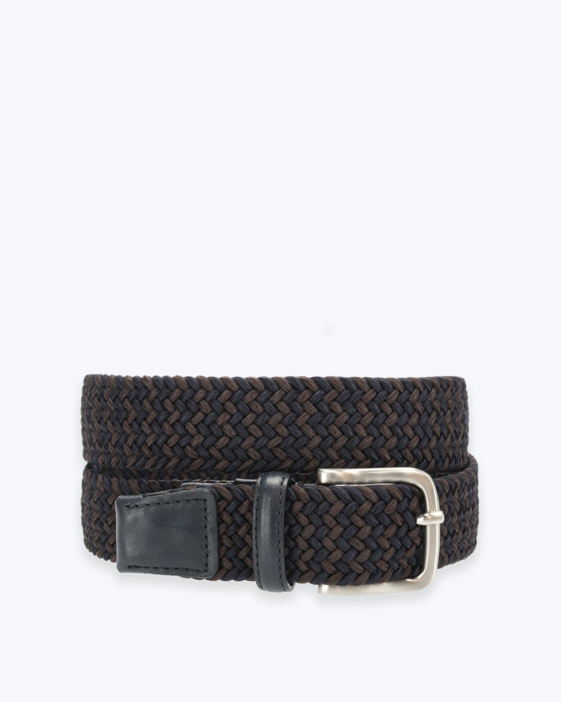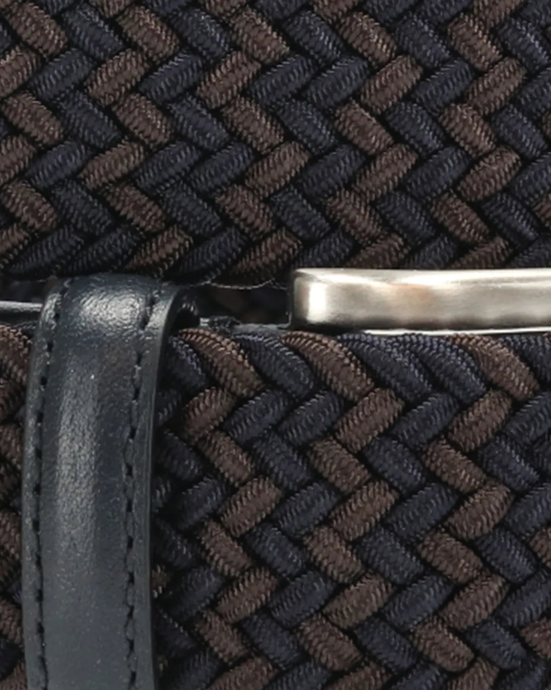 Cinturón trenzado elástico de la marca Gavazzeni en color azul y marrón, con hebilla cuadrada y remates en piel azul.
