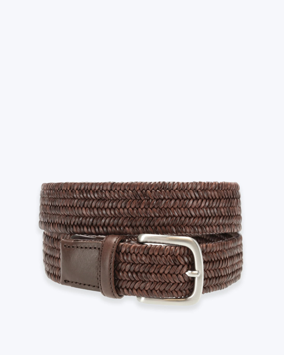 Cinturón trenzado elástico de la marca Gavazzeni en color marrón, con hebilla cuadrada y remates en piel marrón.
