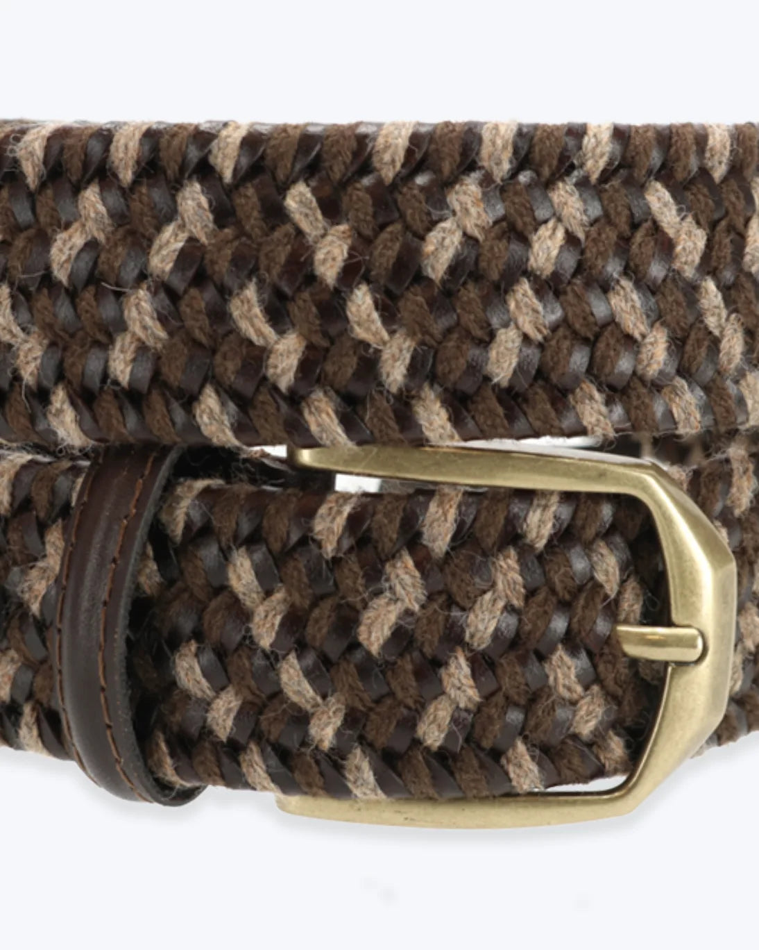 Cinturón trenzado elástico de piel y algodón de la marca Athison, con hebilla cuadrada y remates en piel marrón.