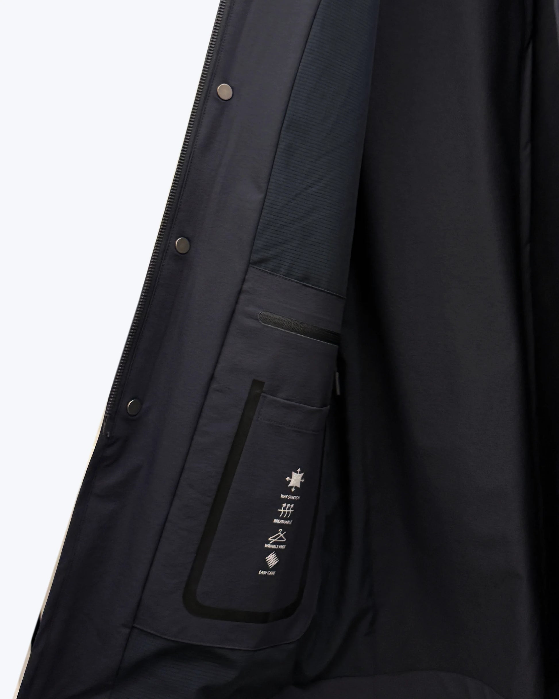 Incorpora un cierre frontal de cremallera bidireccional, discretamente oculta bajo una tapeta con botones automáticos. Dispone de dos bolsillos laterales integrados con cierre de imán y tres bolsillos interiores, pensados para ofrecer practicidad sin renunciar al diseño.