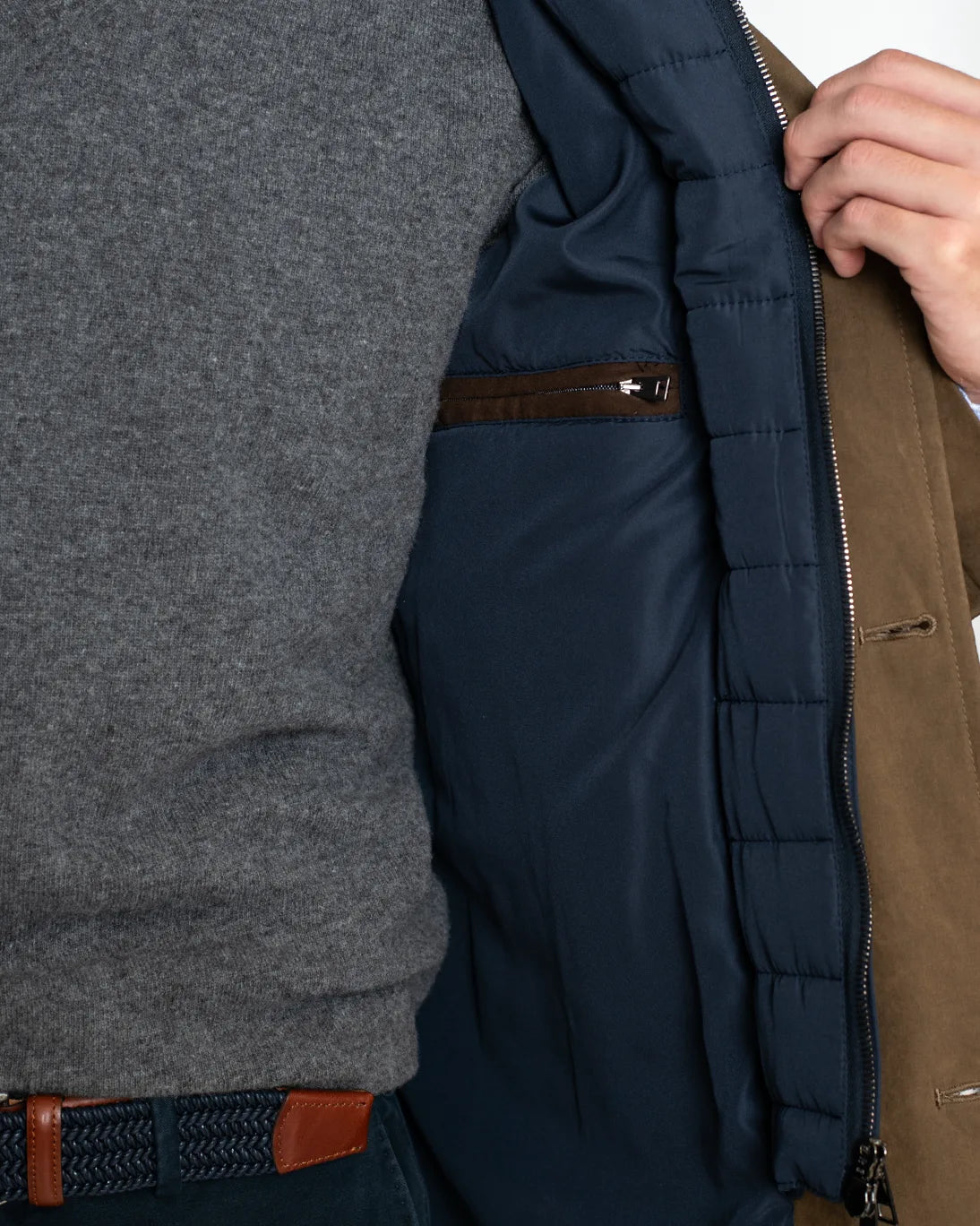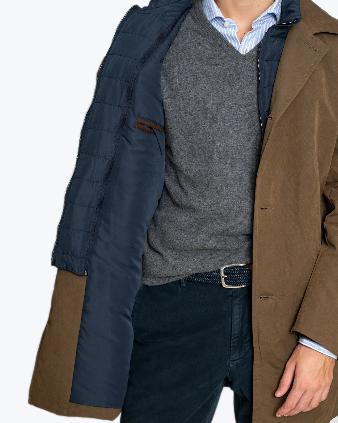Se abrocha con botones, y tiene tapetas acolchadas extraíbles (mediante cremallera) en azul marino, así como un forro acolchado, que le aportan un extra de abrigo y aislamiento del viento.