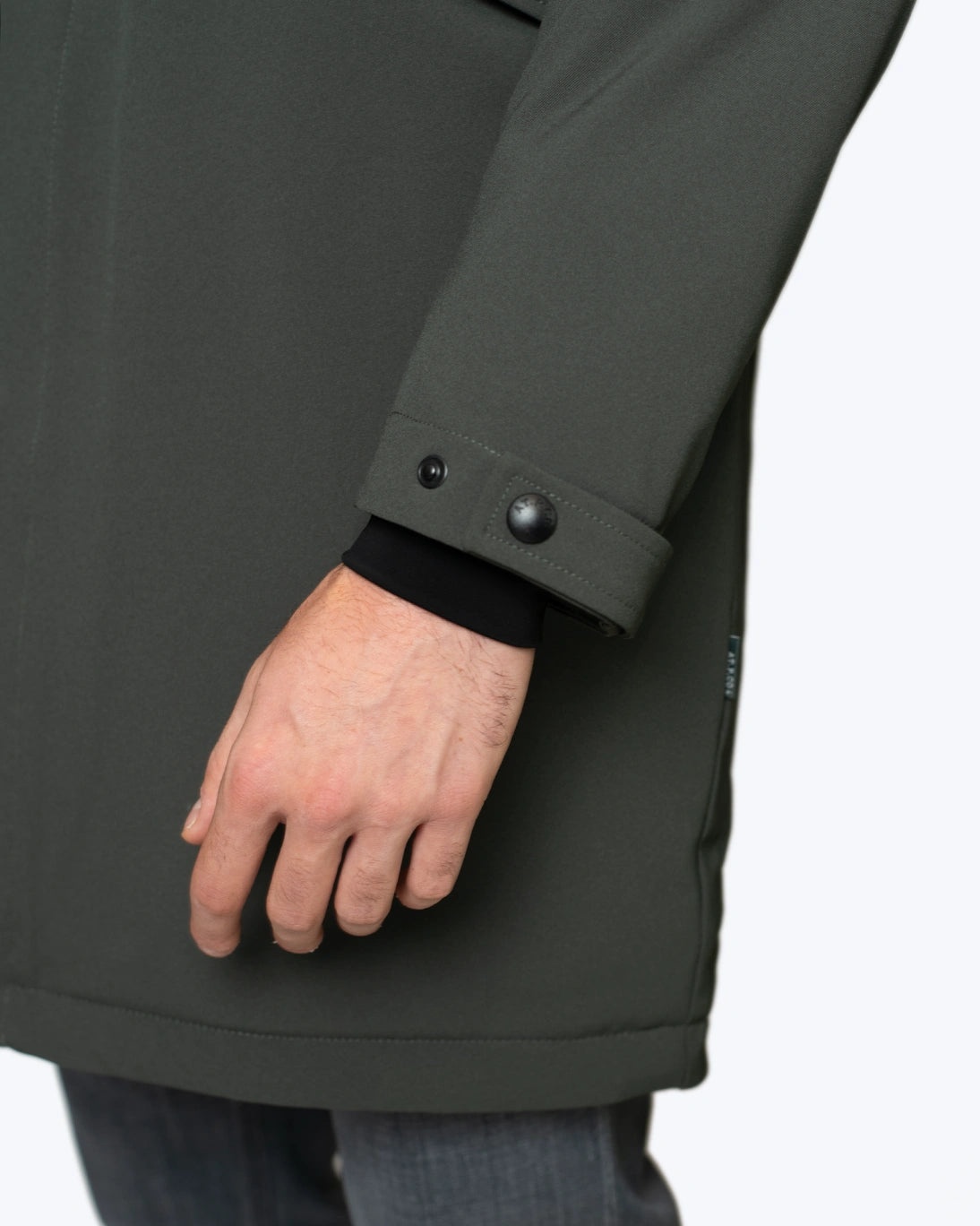 Su tejido técnico garantiza aislamiento térmico y resistencia a la lluvia, ideal para los días más fríos.